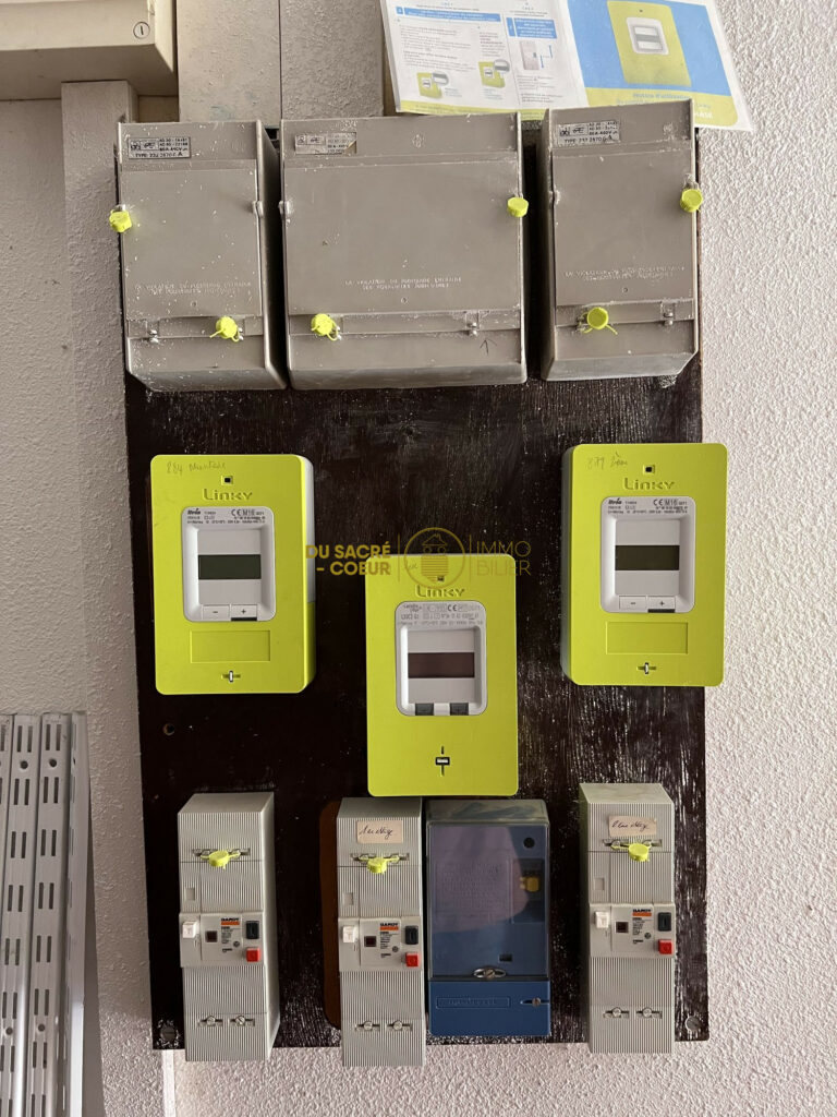Parties communes avec disjoncteurs et compteurs d’eau, espace de stockage vélo, poussette.