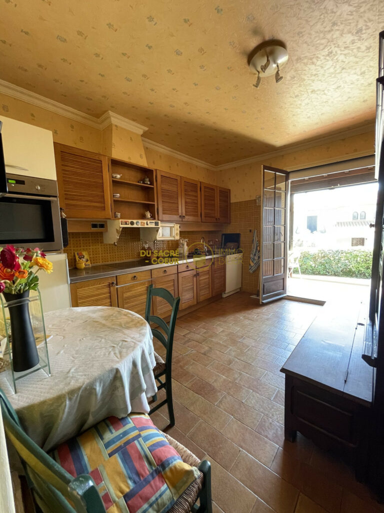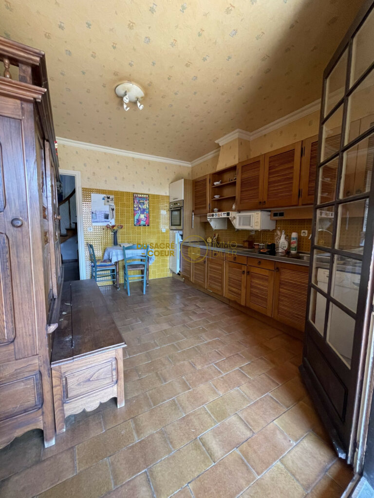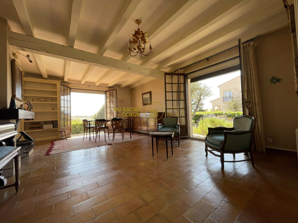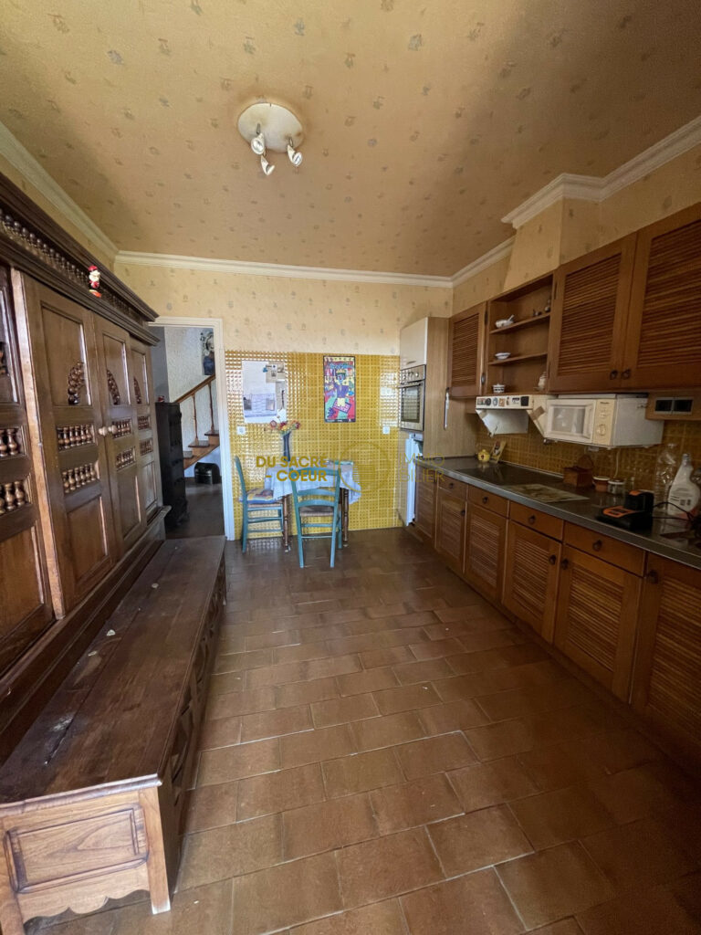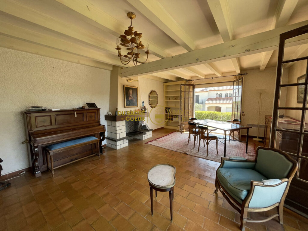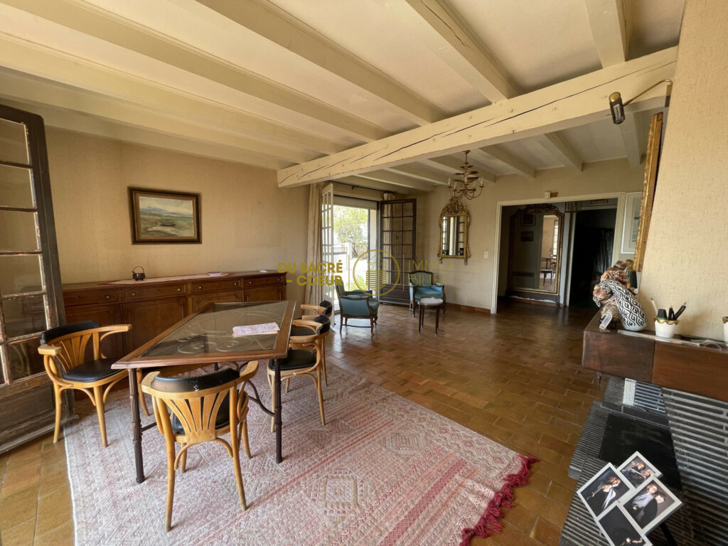 la pièce de vie , actuellement vécu en salon séjour de plus de 30m2 avec cheminée est attenante à la grande cuisine indépendante entièrement equipée avec accès direct sur une véranda de 13m2 avec barbecue