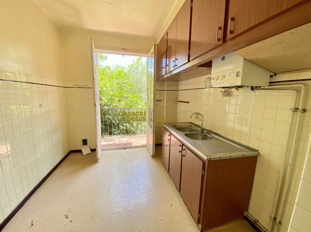 Cuisine de 6,58m² avec porte fenêtre donnant sur balcon agréable vue verdure.