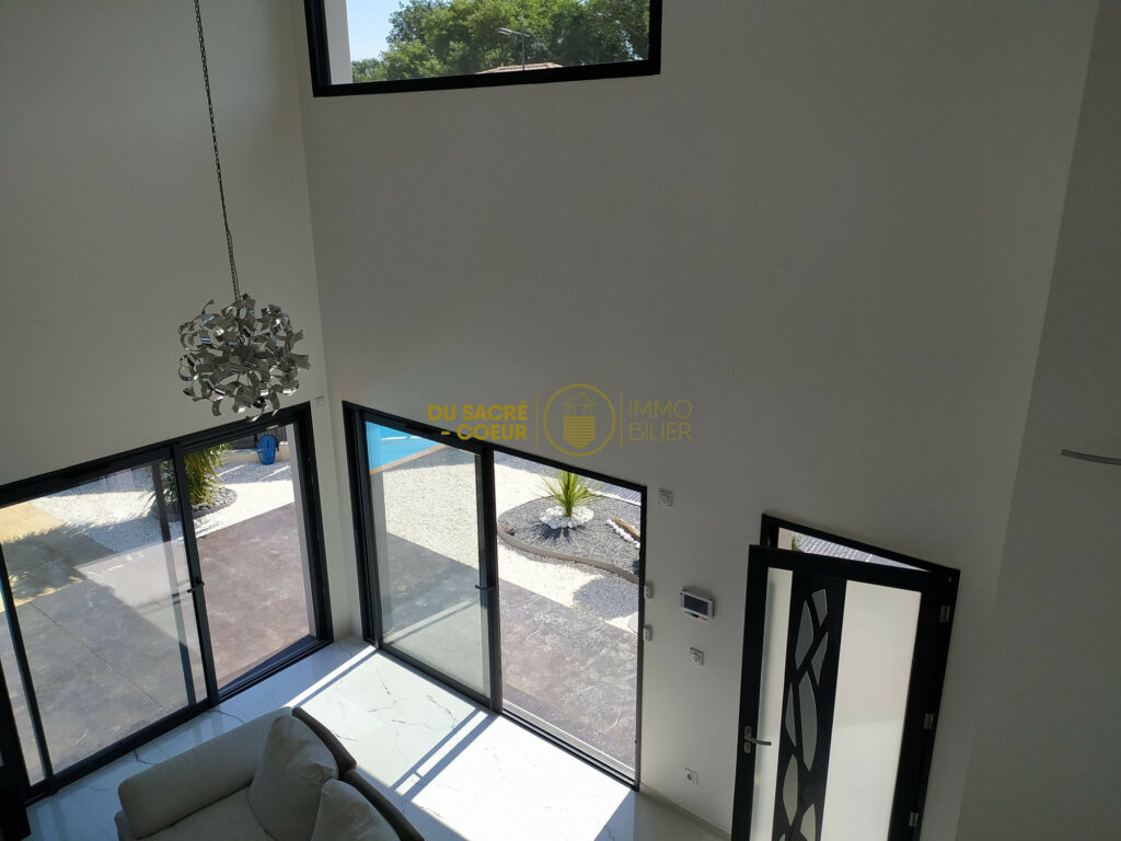 Le Salon Séjour Bénéficie d’une Hauteur de Plafond à 5m66 avec Grandes Baies Vitrées pour une Belle Vue Piscine
