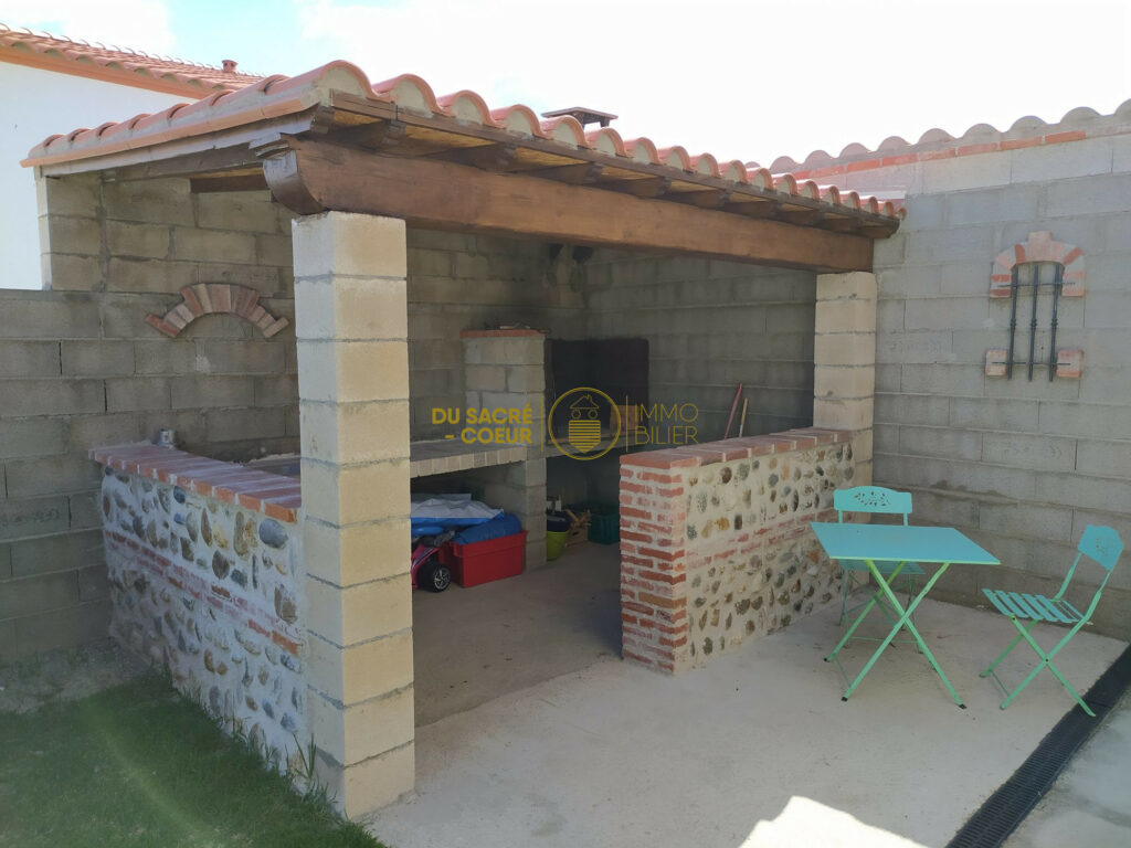 Coté Jardin Une superbe cuisine d’été Maçonnée en Pierre de rivières Equipée d’un BBQ et Evier avec plan de travail et rangement