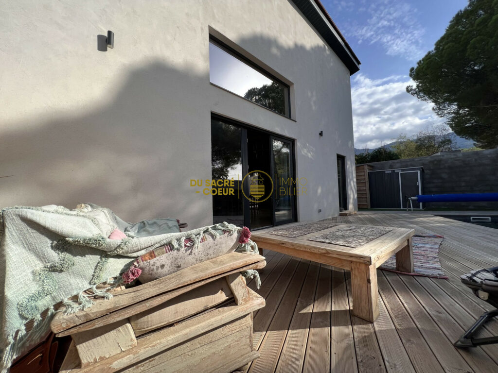 EXCLUSIVITE dans les Albères à VILLELONGUE-DELS-MONTS Chaleureuse Villa P Pied ossature bois T5 récente sur 478m² de parcelle avec piscine au calme. Venez découvrir cette villa écoresponsable de l’année 2019 de plus de 200m² habitable.